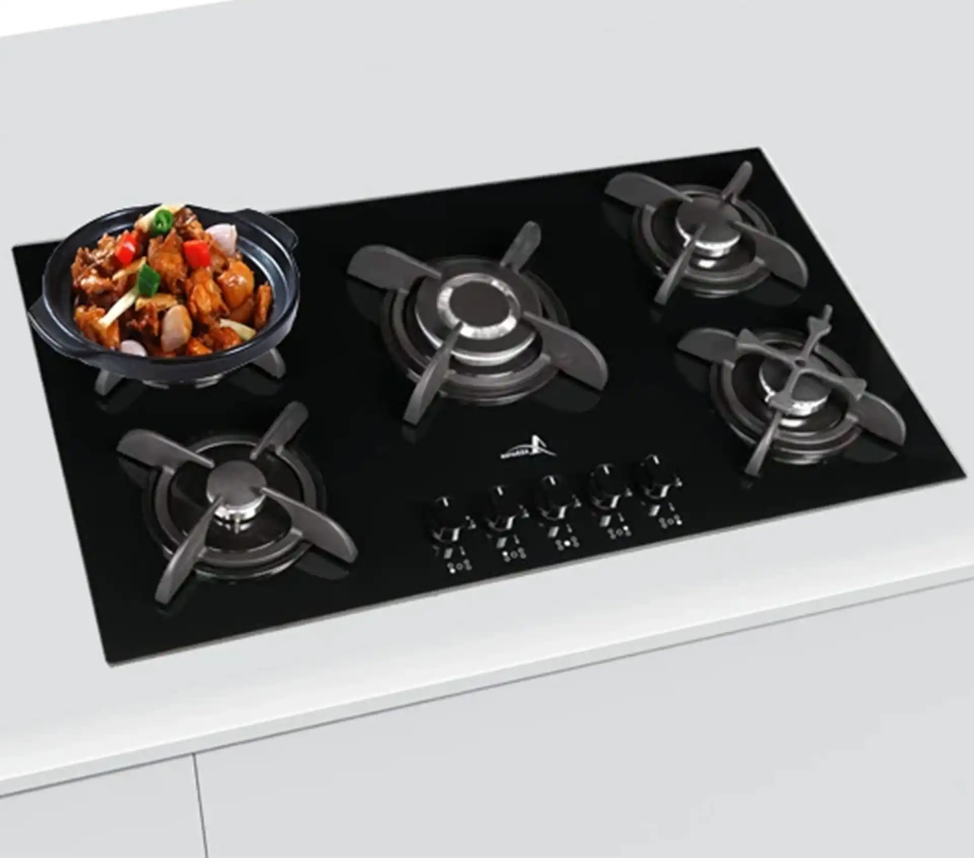 خرید و قیمت گاز صفحه ای و رومیزی اخوان GI144-NP از جنس شیشه سکوریت رنگ مشکی و 5 شعله ، صفحه چدن دایکاسیتی 5 تکه و قطعات ایرانی