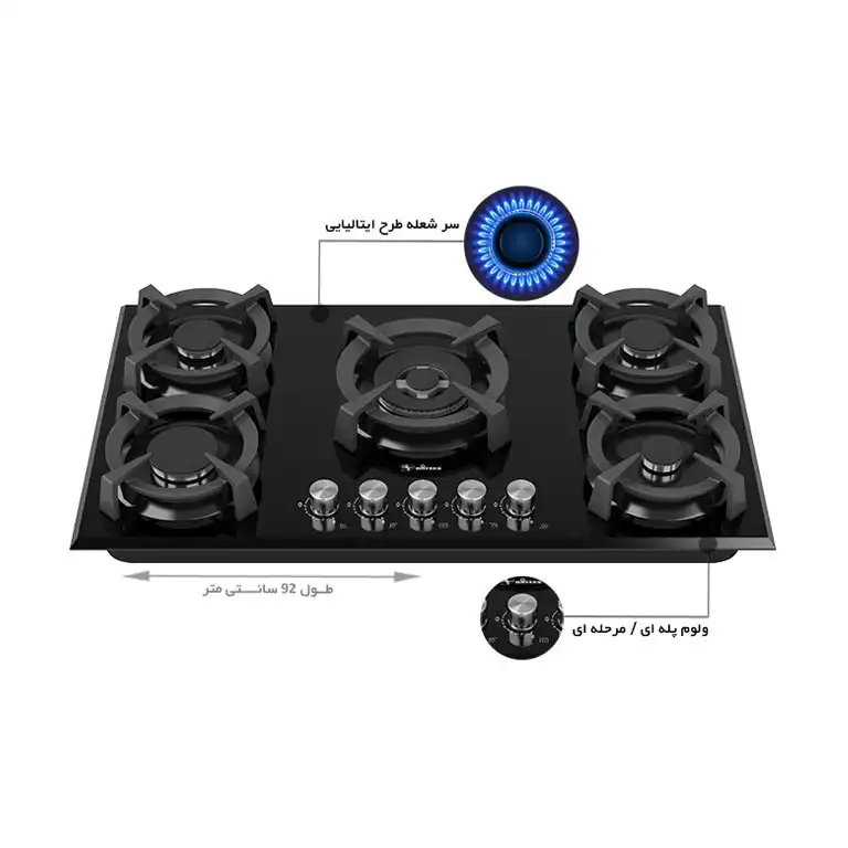 • ابعاد شعله ها : 2 شعله متوسط و 1 شعله کوچک و 1 بزرگ و 1 پلوپز