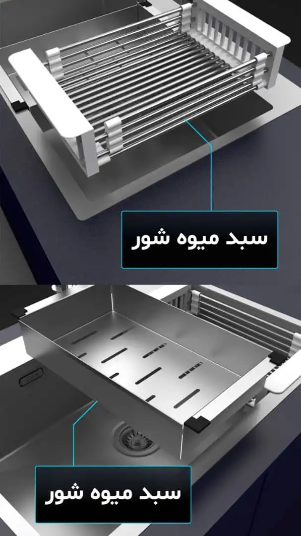 سبد میوه شور، آب چکان کشویی، نیم لگن پیشبند، جامایع، اسپری براق کننده، حوله آبگیر |