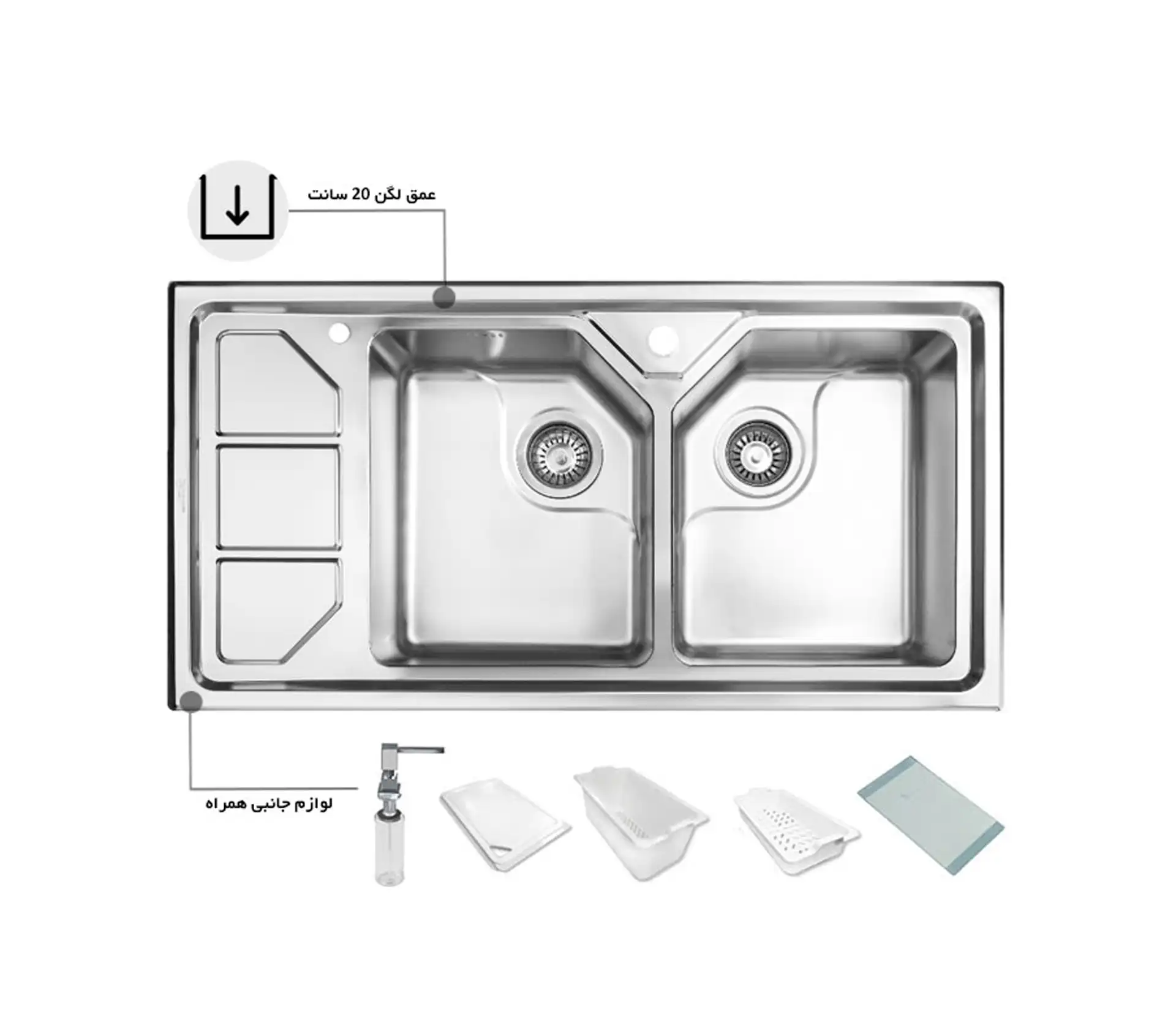 خرید و قیمت سینک ظرفشویی توکار باکسی استیل اخوان کد 326  با عمق 20 سانتیمتر و طول 100 سانت با دو لگن، یک سینی