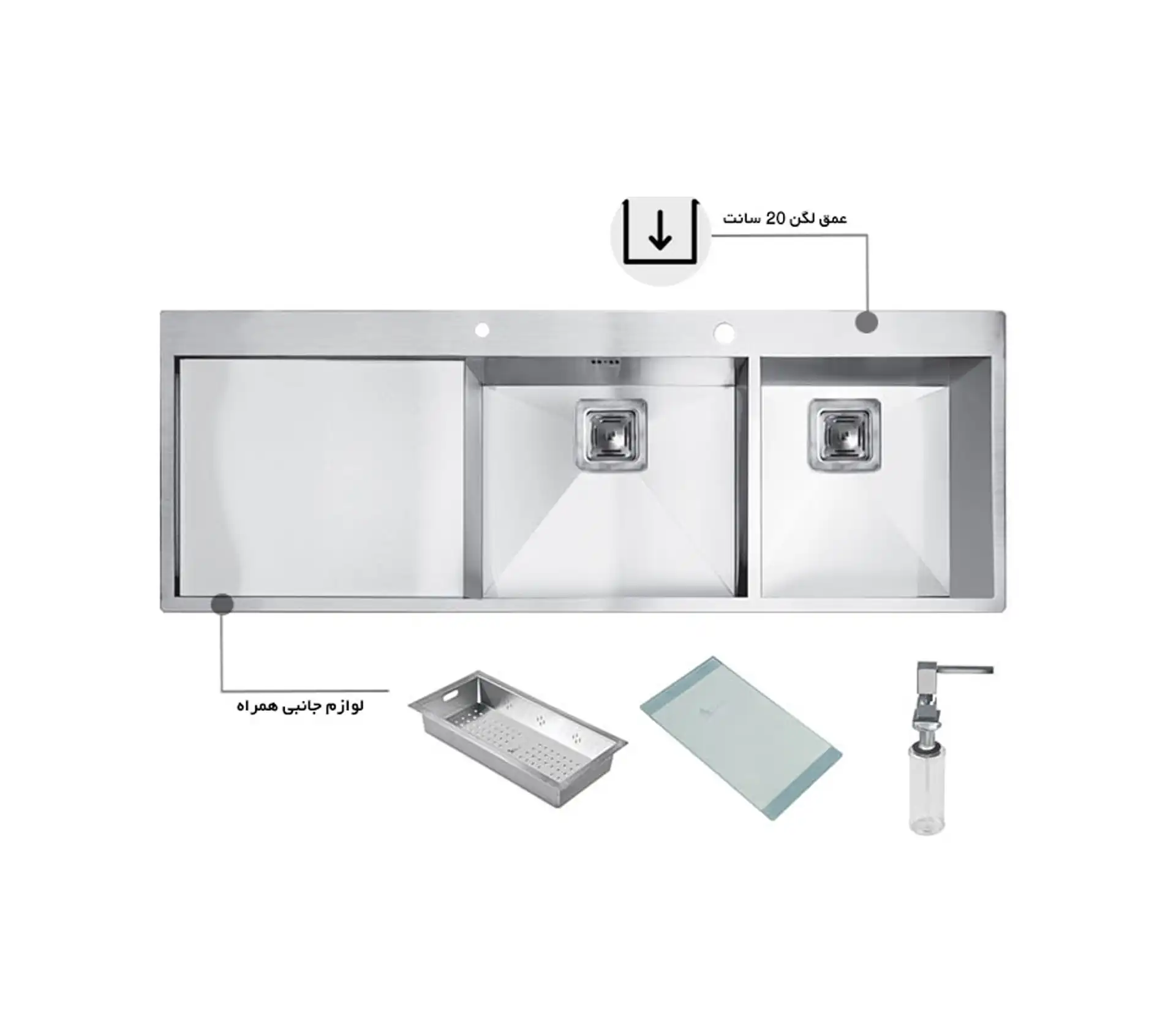 خرید و قیمت سینک ظرفشویی توکار باکسی استیل اخوان کد 346  با عمق 20 سانتیمتر و طول 140 سانت با دو لگن، یک سینی