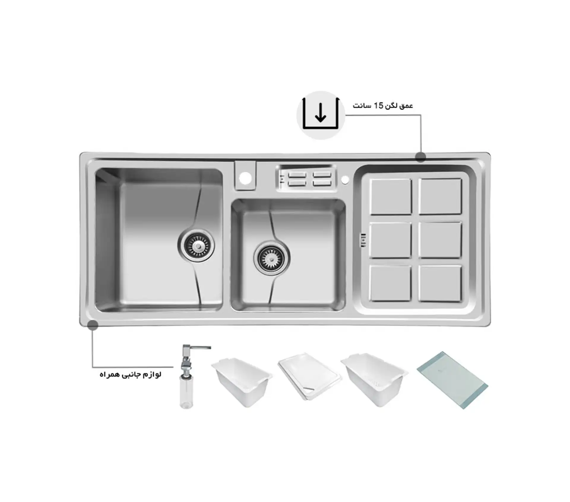 خرید و قیمت سینک ظرفشویی توکار باکسی استیل اخوان کد 360  با عمق 15 سانتیمتر و طول 120 سانت با دو لگن، یک سینی