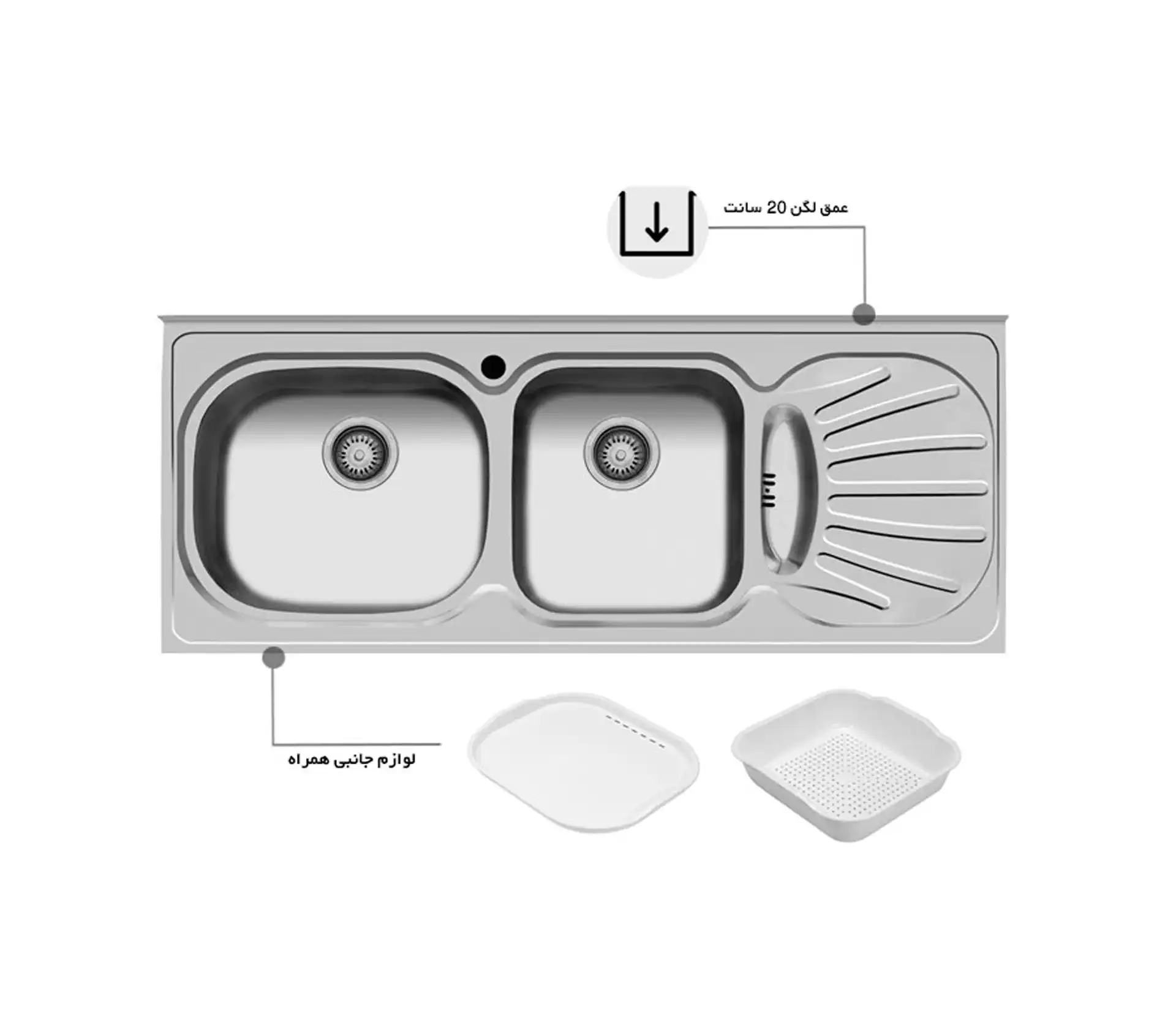 خرید و قیمت سینک ظرفشویی توکار استیل اخوان کد 36 با عمق 17 سانتیمتر و طول 120 سانت با دو لگن، یک سینی