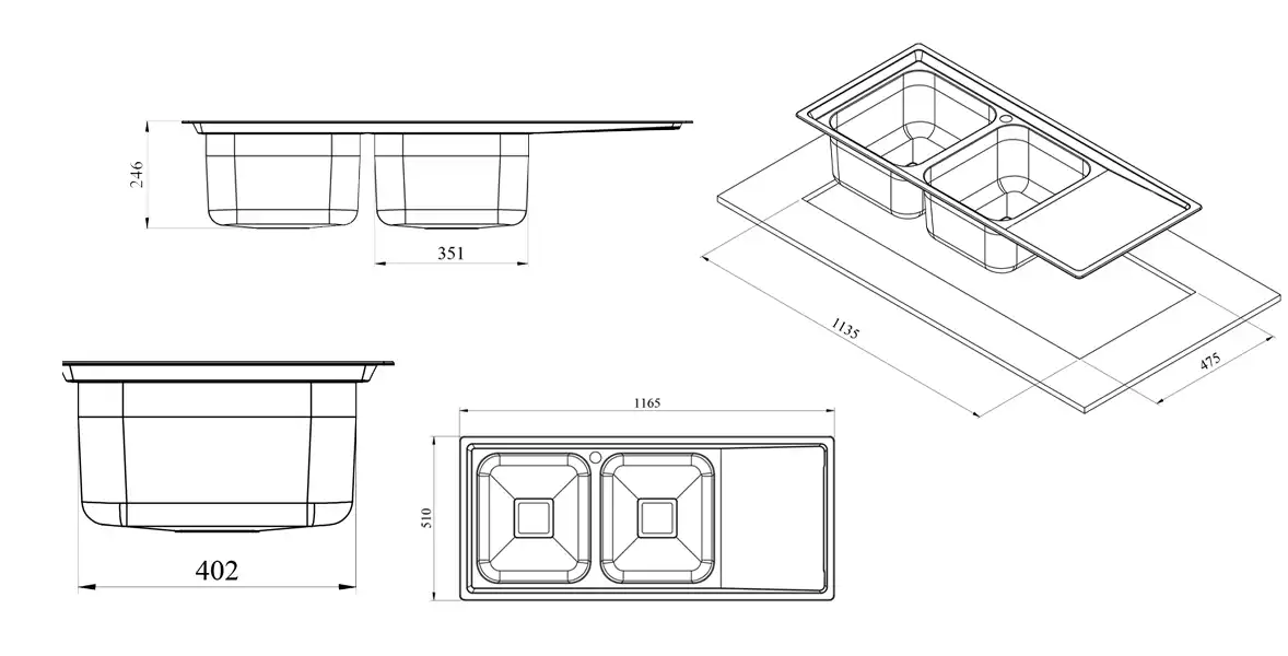 ابعاد برش سینک 113.5 * 47 سانتی‌متر است.