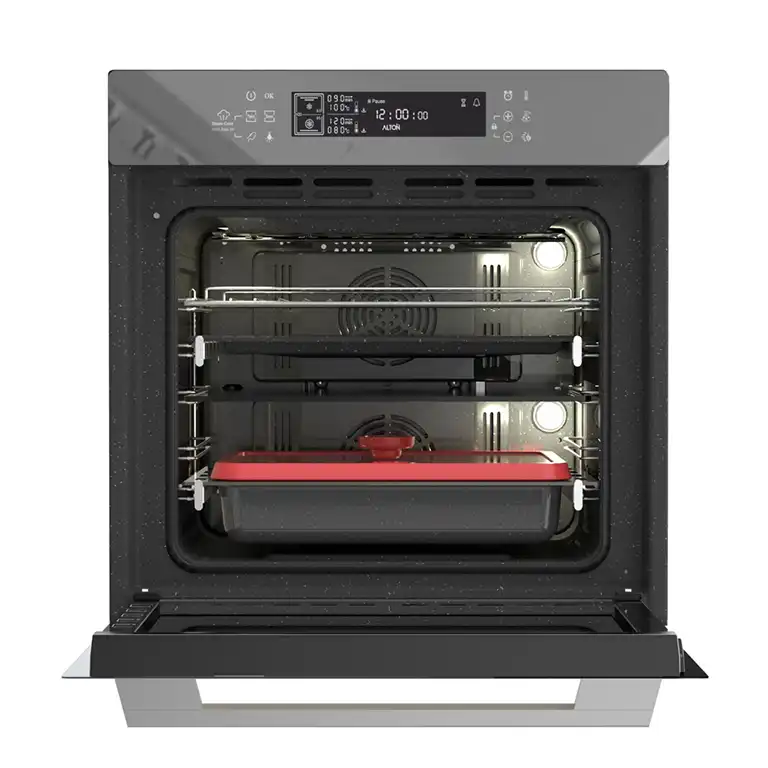فر توکار V503T آلتون دارای یک صفحه نمایش دیجیتالی بوده که می‌تواند تنظیمات مختلف فر را برایتان با جزئیات نمایش دهد. با استفاده از این صفحه نمایش می‌توانید به‌راحتی دستوراتتان را تنظیم نمایید. از طرفی دیگر، فر برقی آلتون V503 بخارپز دارای یک برنامه یخ‌زدایی برای غذاهای منجمد اسـت. بدین معنا که می‌توانید غذاهای منجمدتان را داخل فر گذاشته و برنامه یخ‌زدایی را فعال کنید. تا فر در کم‌ترین زمان ممکن و با استفاده از یک حرارت ملایم و تدریجی، غذاهای منجمدتان را وارد مرحله آماده به پخـت کند. این محصول همچنین دارای یک ریل تلسکوپی و قفل کودک اسـت. فر آلتون بخارپز ، فر برقی آلتون V503 با آپشن جدید بخارپز سلامتی را به خانه هایتان آورده. یکی از مزایای خرید فر برقی آلتون V503T بخارپز امکان طبخ سبزیجات، گوشت و مرغ و… بصورت بخارپز اسـت بدون از دست دادن کیفیت و ویتامین‌ها.