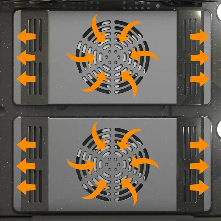 • فن گردش هوا، به‌جهت یکسان کردن هوای داخل فر در تمامیه نقاط برای پختی یکدست
