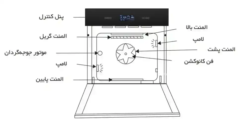 دارای سیستم حرکت هوا در جداره های درب فر جهت خنک ماندن شیشه