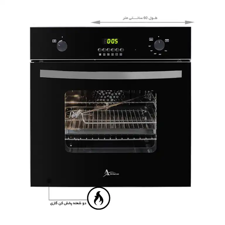 مشخصات فر توکار گازی اخوان مدل F28 به رنگ مشکی جنس و نمای ظاهری شیشه با ظرفیت 70 لیتر و 3 برنامه پخت خریدی امن از نمایندگی فروش اخوان