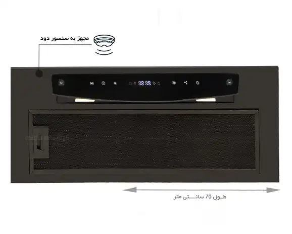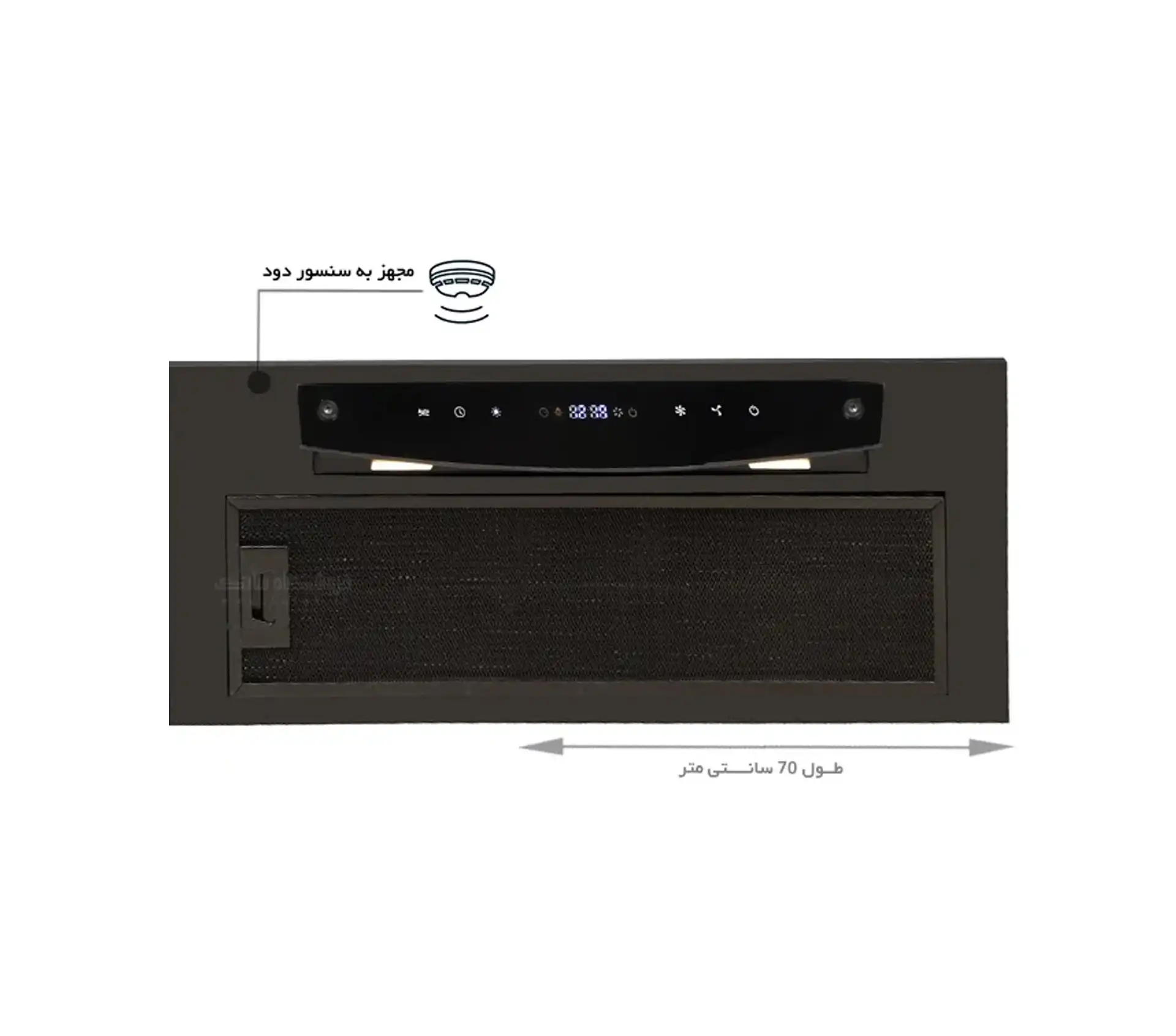 خرید و قیمت هود آشپزخانه  اخوان مدل H203 طراحی به صورت مخفی، عرض 70 سانتیمتر از جنس استیل و رنگ مشکی، موتور پلاستیک ، به همراه کنترل لمسی، ریموت کنترل