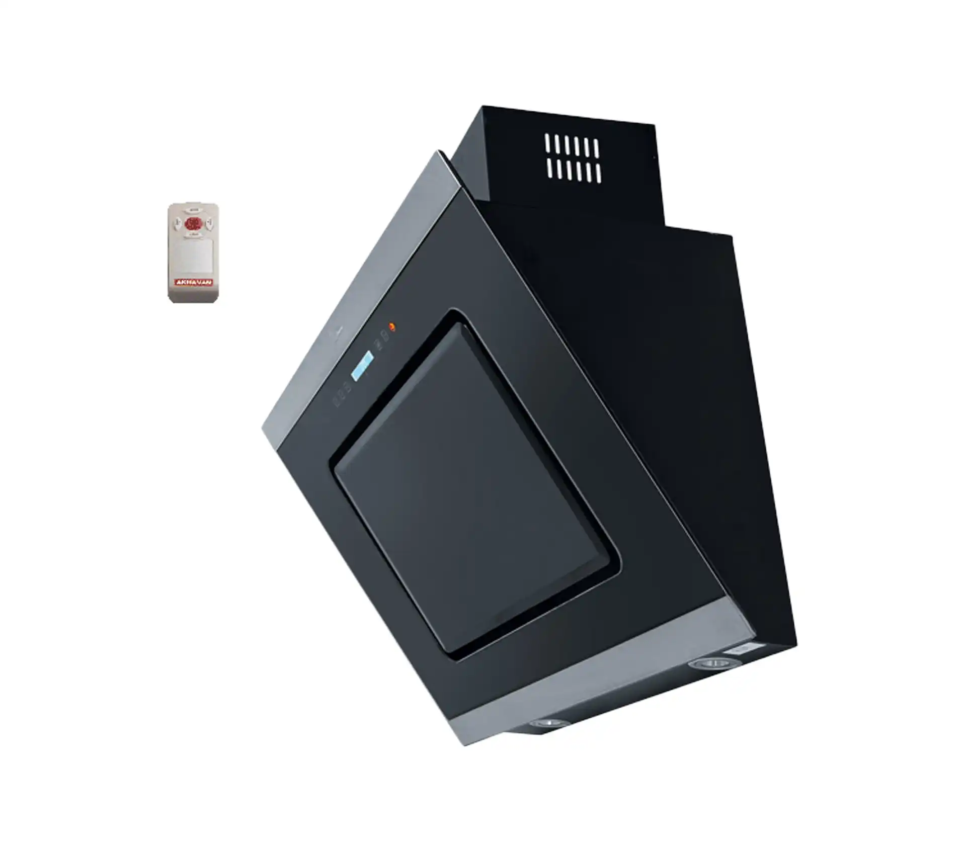 خرید و قیمت هود آشپزخانه  اخوان مدل H45 طراحی به صورت مورب، عرض 90 سانتیمتر از جنس شیشه و رنگ مشکی، موتور فلزی 4 دور پلاستیک ، به همراه ریموت کنترل