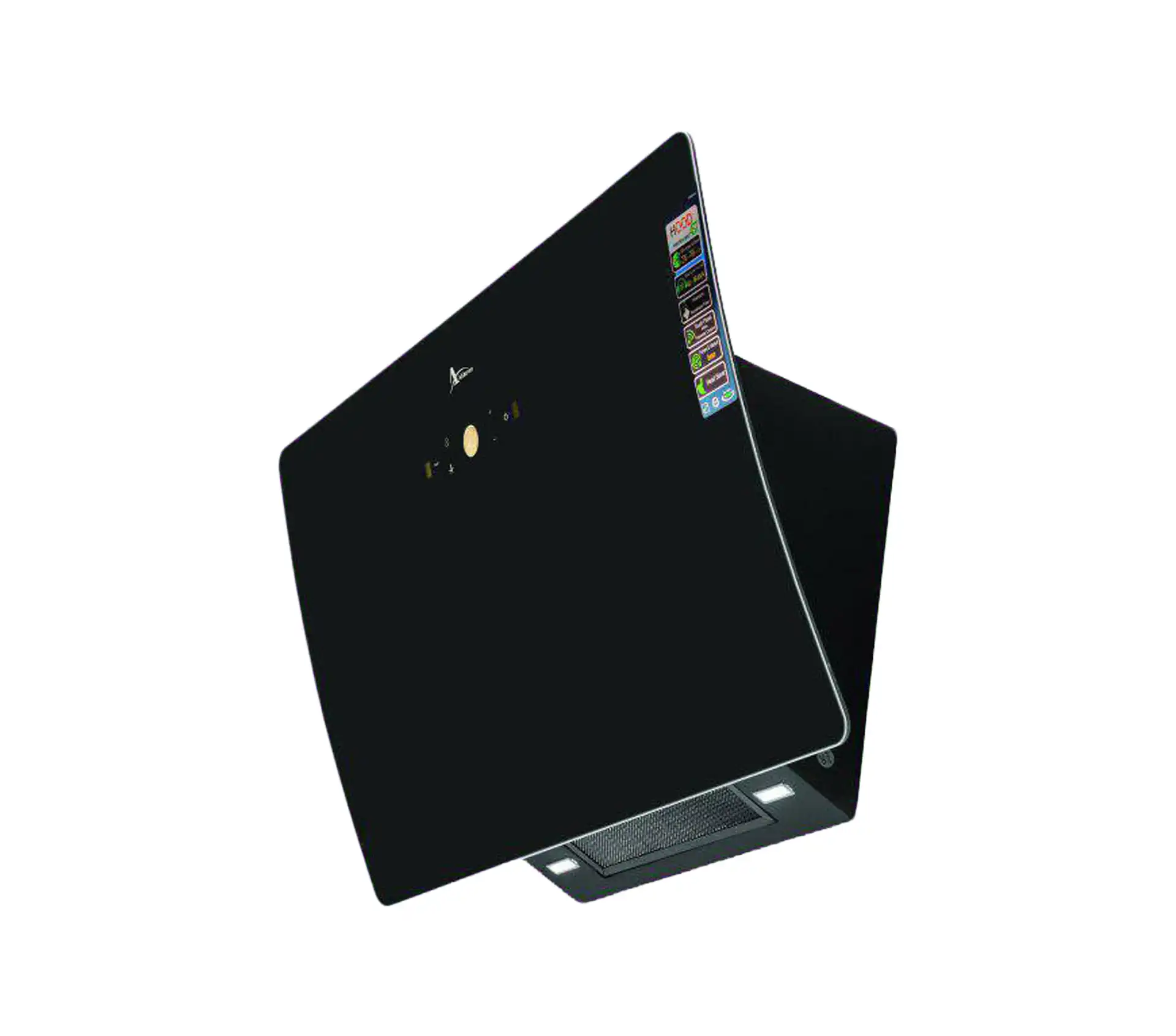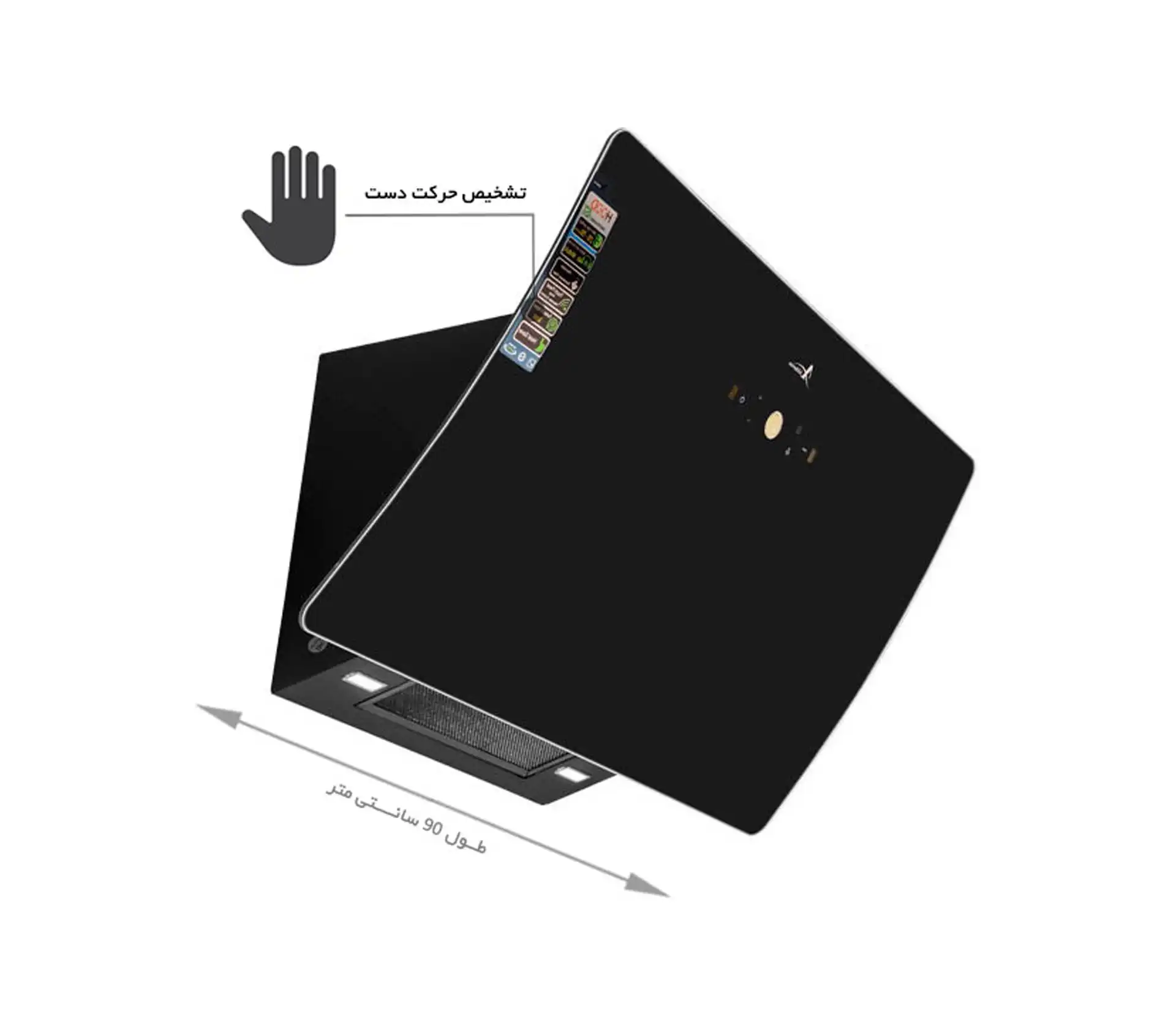 خرید و قیمت هود آشپزخانه اخوان مدل H77 طراحی به صورت مورب، عرض 90 سانتیمتر از جنس شیشه ای بدنه مشکی، موتور فلزی 4 دور پلاستیک ، سنسور دود