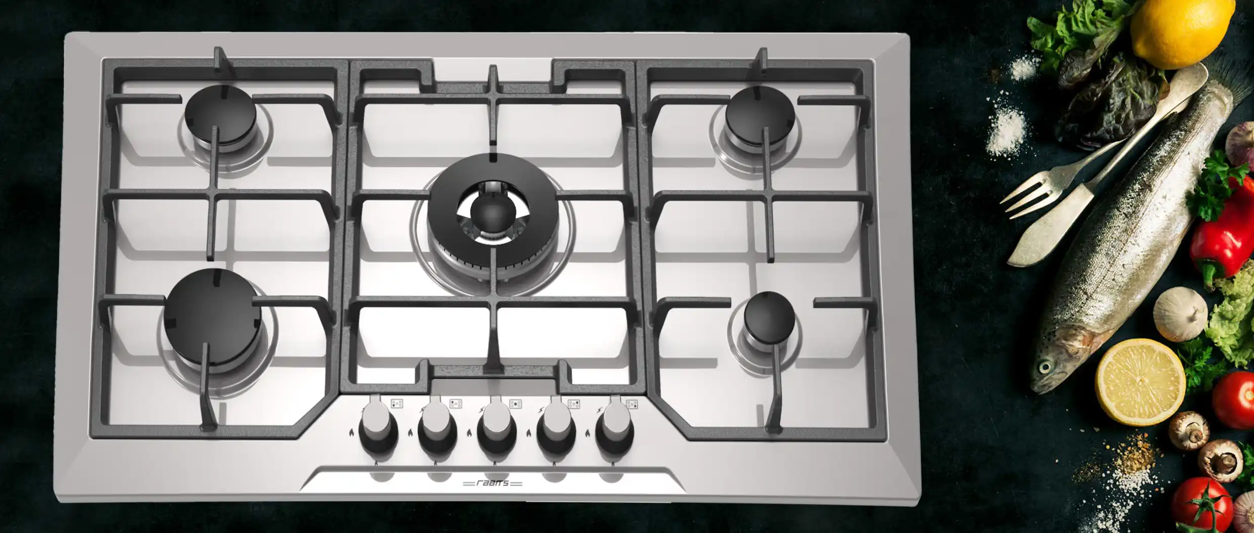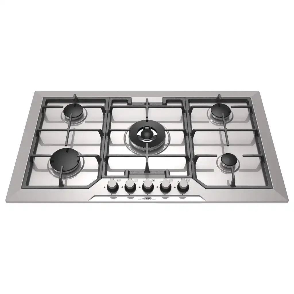 گاز رومیزی و صفحه ای رابیتس RS 500 از جنس استیل ضد خط و خش، با 5 شعله به همراه پلوپز وسط 3 ژیگلوره طرح دیفندی و سرشعله های کناری H راندمان بالا میباشد.