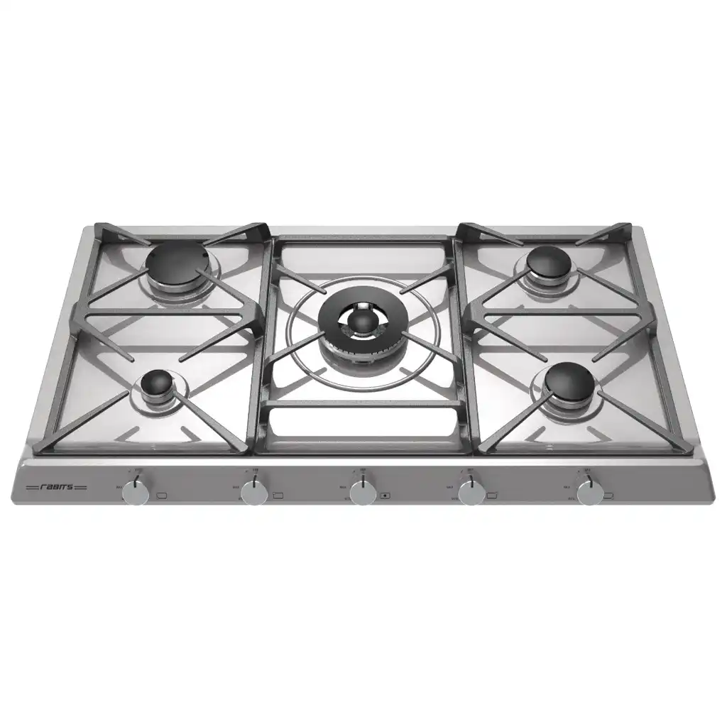 خرید و قیمت گاز صفحه ای و رومیزی رابیتس RS-502 از جنس استیل و 5 شعله، صفحه چدن 3 تکه و ترموکوپل تاپ تایم اورکلی اسپانیا ، شعله پلوپز 3 ژیگلوره طرح دیفندی