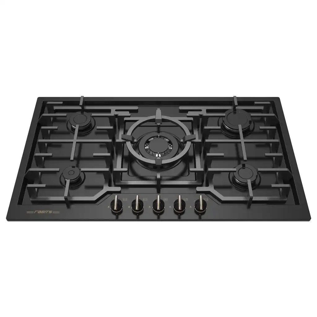 خرید و قیمت گاز صفحه ای و رومیزی رابیتس RS-520 از جنس لعاب مشکی و 5 شعله، صفحه چدن 3 تکه و ترموکوپل تاپ تایم اورکلی اسپانیا