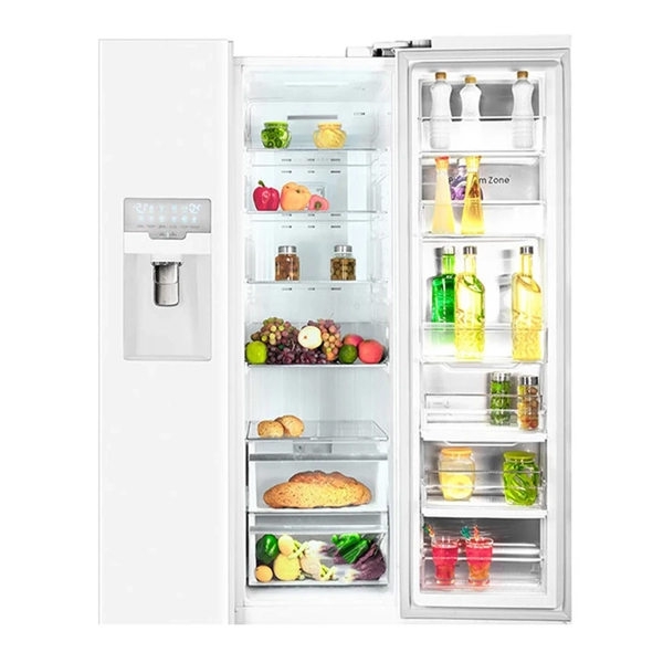 ظاهر شکیل با رنگ سفید متالیک براق، دستگیرههای مخفی و پنل نمایشگر لمسی LED، ظاهری لوکس و یکدست به این مدل بخشیدهاند. طراحی SBS به شما اجازه میدهد بدون باز کردن کامل دربها، به بخشهای مختلف دسترسی داشته باشید. درب سوم با عنوان Platinum Zone نیز به عنوان بار خانگی در نظر گرفته شده تا مصرف انرژی کاهش یابد و دسترسی سریعتری به اقلام پرمصرف داشته باشید.
