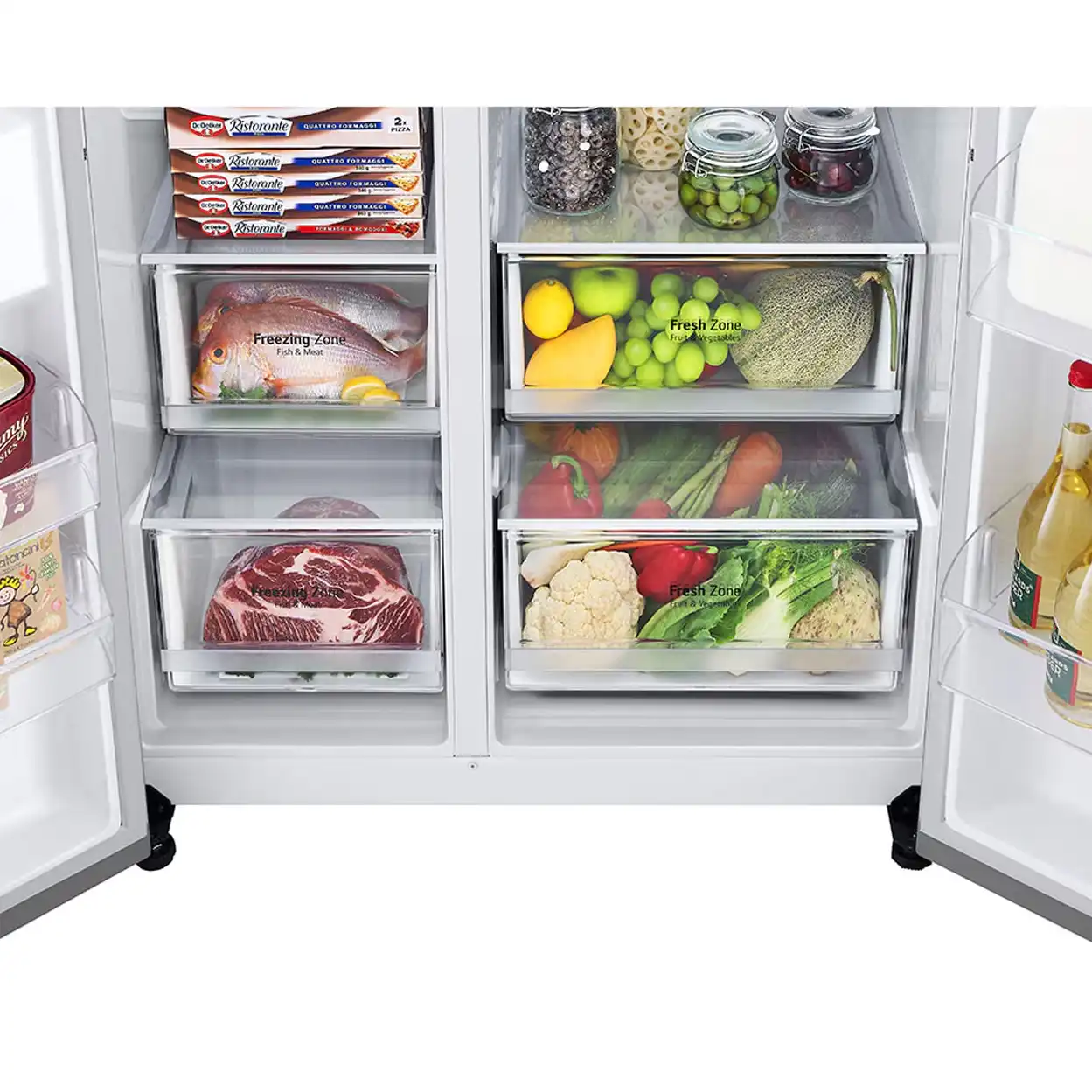 یخچال فریزر رنگ نقره ای ال جی LG تعداد قابل قبولی کشو و طبقات مناسب برای جایگذاری انواع مواد غذایی را  دارد.