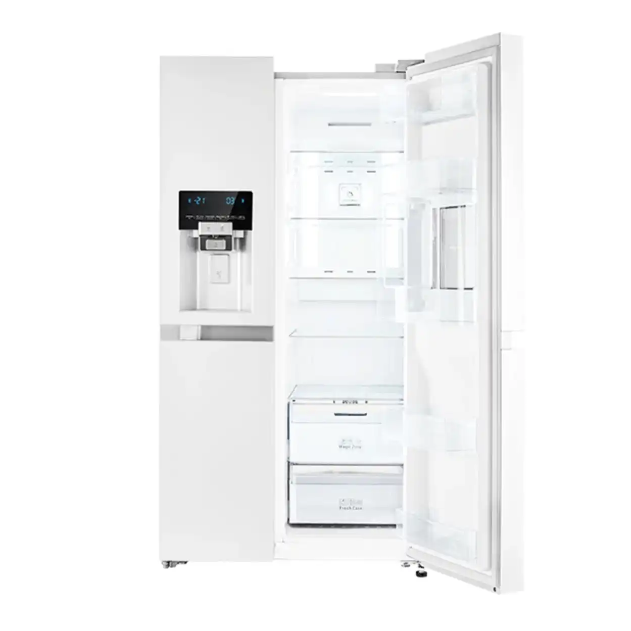 یخچال فریزر رنگ سفید متالیک 33 فوت دوو Daewoo تعداد قابل قبولی کشو و طبقات مناسب برای جایگذاری انواع مواد غذایی را دارد.