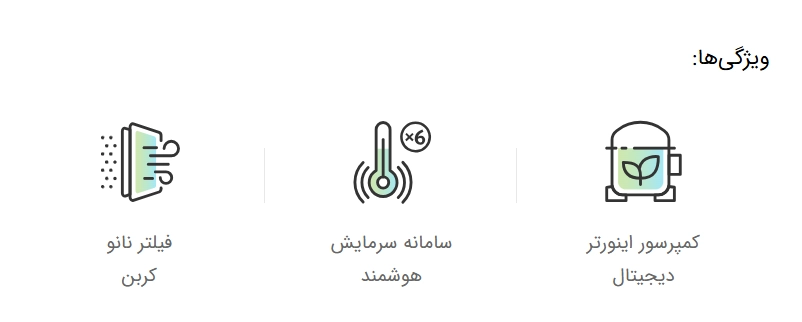 • کمپرسور اینورتر دیجیتال: کاهش مصرف انرژی، افزایش طول عمر، و صدای بسیار کم (43 دسی‌بل).