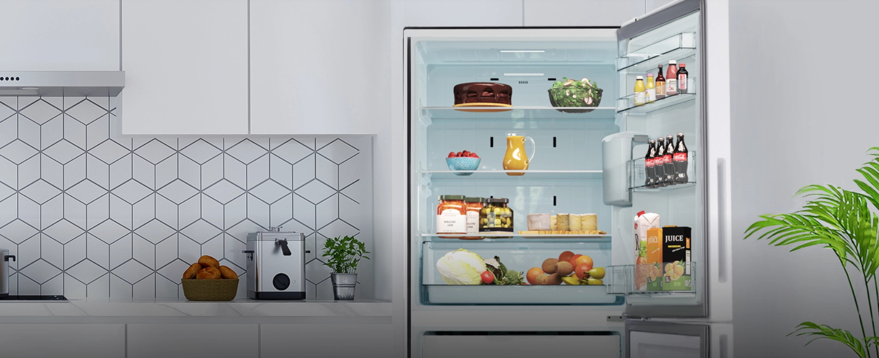 ظاهر شکیل با رنگ سفید براق، دستگیره‌های مخفی و پنل نمایشگر لمسی LED، ظاهری لوکس و یکدست به این مدل بخشیده‌اند. طراحی BMF به شما اجازه می‌دهد بدون باز کردن کامل درب‌ها، به بخش‌های مختلف دسترسی داشته باشید.